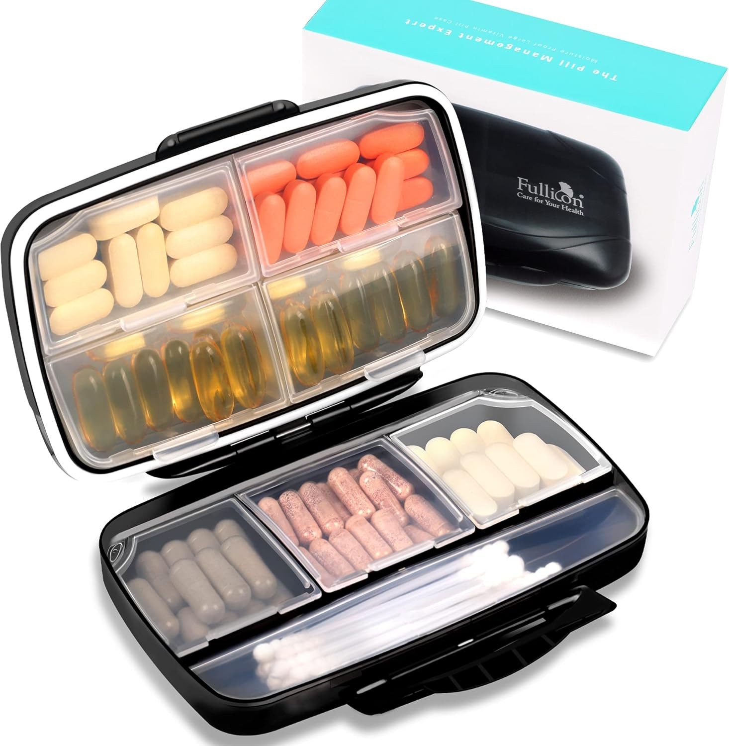 Fullicon Travel Pill Box Organiser Large Portable, Oversize 8 Compartment Pill B