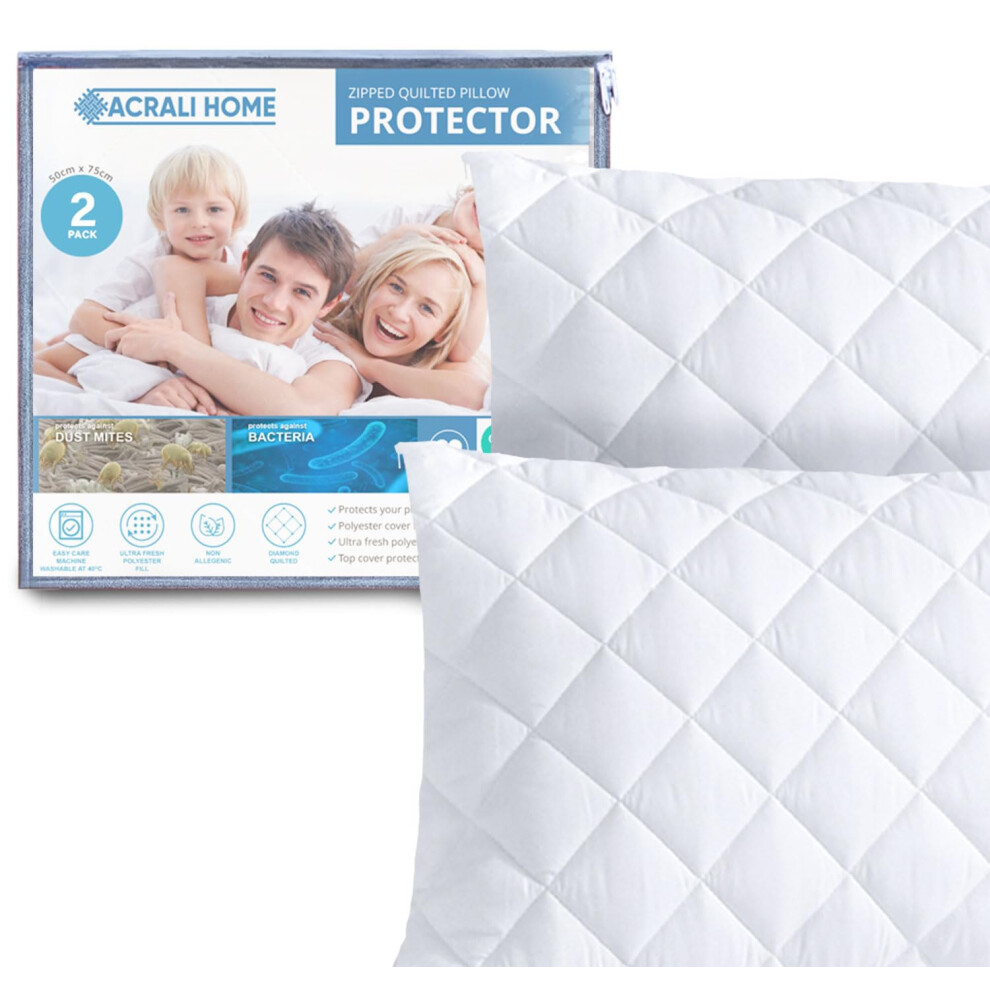 ACRALI HOME Quilted Pillow Protectors 2 Pack Zipped - 50x75 cm Hypoallergenic Pillowcase Protectors - Soft & Breathable Luxurious Pillow Cover for Comfortable Sleep