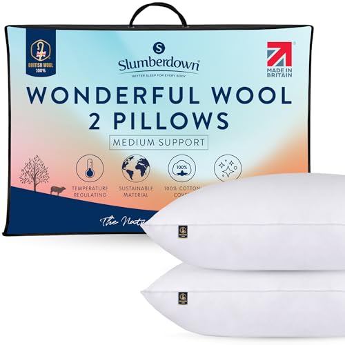 Slumberdown 100% British Wool Pillows 2 Pack - Naturally Cooling & Moisture-Wicking for Hot Sleepers, Luxury Back & Side Sleeper Bed Pillows - Hypoallergenic Cotton Cover, UK-Made (48 x 74cm)