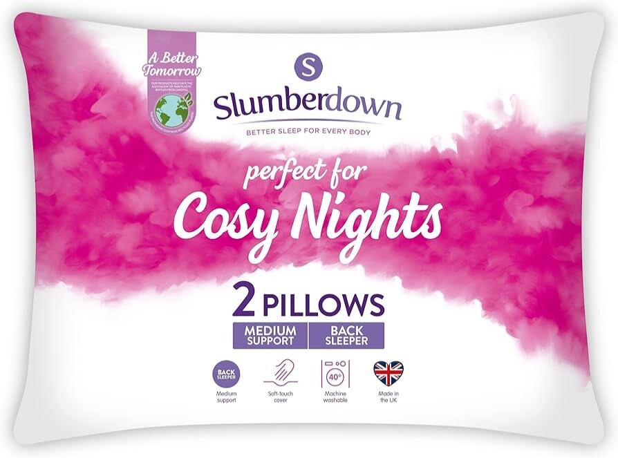 Slumberdown Cosy Nights Bed Pillows 2 Pack Non-Allergenic Medium Support Back & Side Sleeper Pillow - Soft Touch Breathable Cover, Made in the UK & Washable, Packaging May Vary (48 x 74cm)