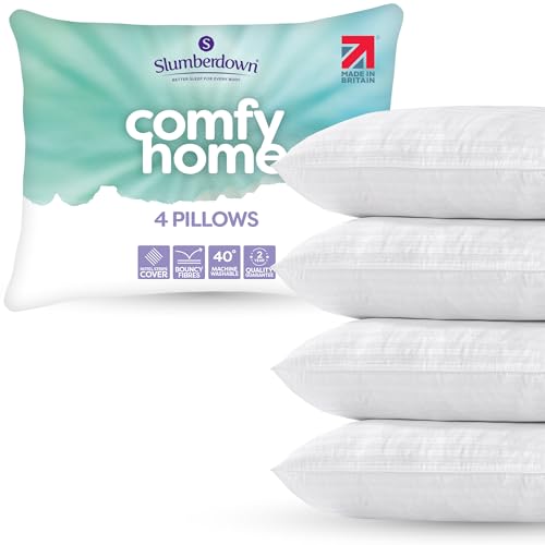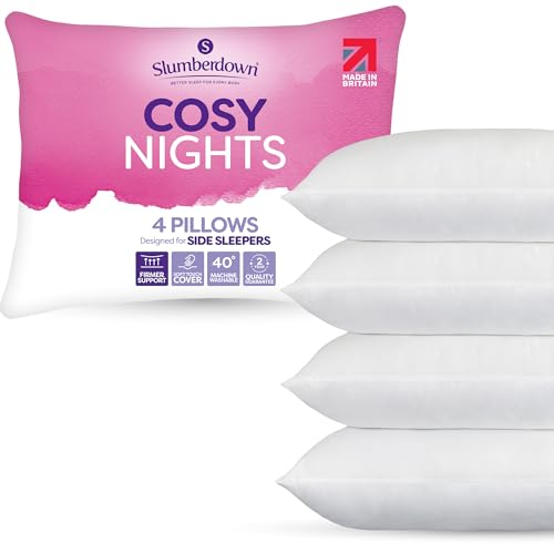 Slumberdown Cosy Nights Bed Pillows 4 Pack Non-Allergenic Firm Support Back & Side Sleeper Pillow - Soft Touch Breathable Cover, Made in the UK & Washable, Packaging May Vary (48 x 74cm)