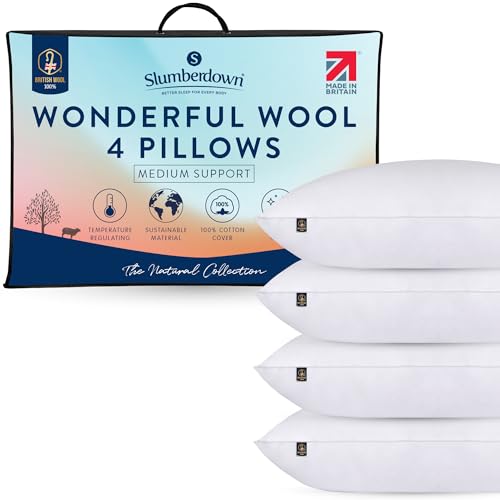 Slumberdown 100% British Wool Pillows 4 Pack - Naturally Cooling & Moisture-Wicking for Hot Sleepers, Luxury Back & Side Sleeper Bed Pillow - Hypoallergenic Cotton Cover, UK-Made (48 x 74cm)