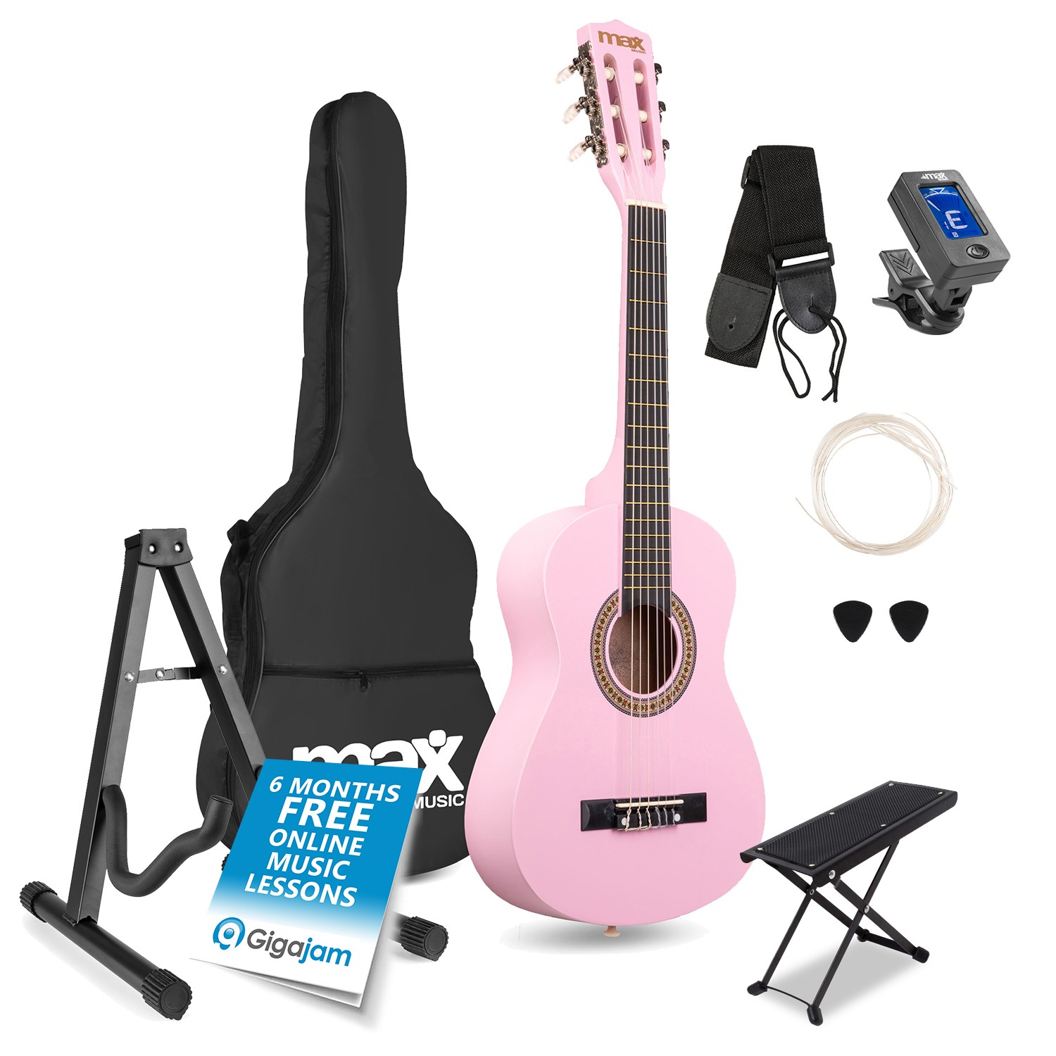 MAX SoloArt Junior Acoustic Guitar 1/4 Size with Tuner, Stool and Stand - Pink