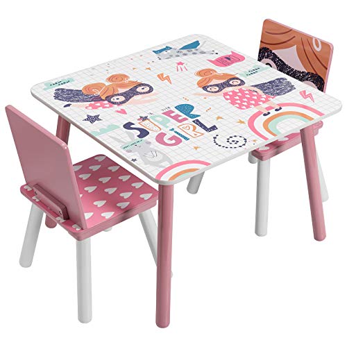 EUGAD Children Table & Chair Sets Pink Desk Table with 2 Chairs Stools Set for Preschoolers Kids Study Activity Wooden