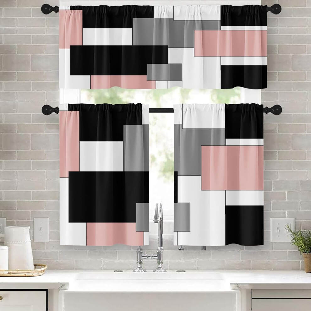 Pink & Gray Kitchen Curtains Set â 36" Modern Rod Pocket Tier + Valance, White Abstract Art Cafe Curtains for Bathroom, Compatible with Standard