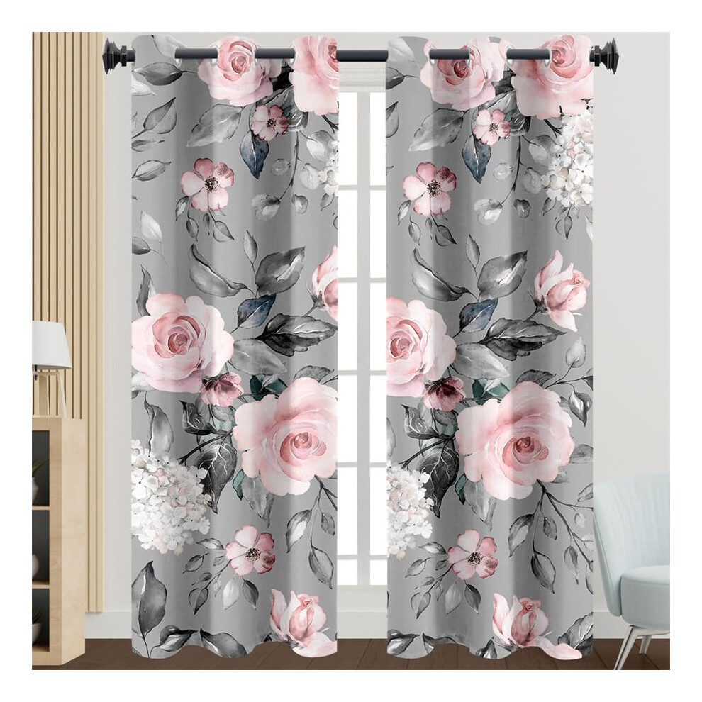 Grey Pink Flower Eyelet Curtains 2x140x180cm Energy Saving Noise Reduction Blackout Heat Insulation for Living Room and Bedroom
