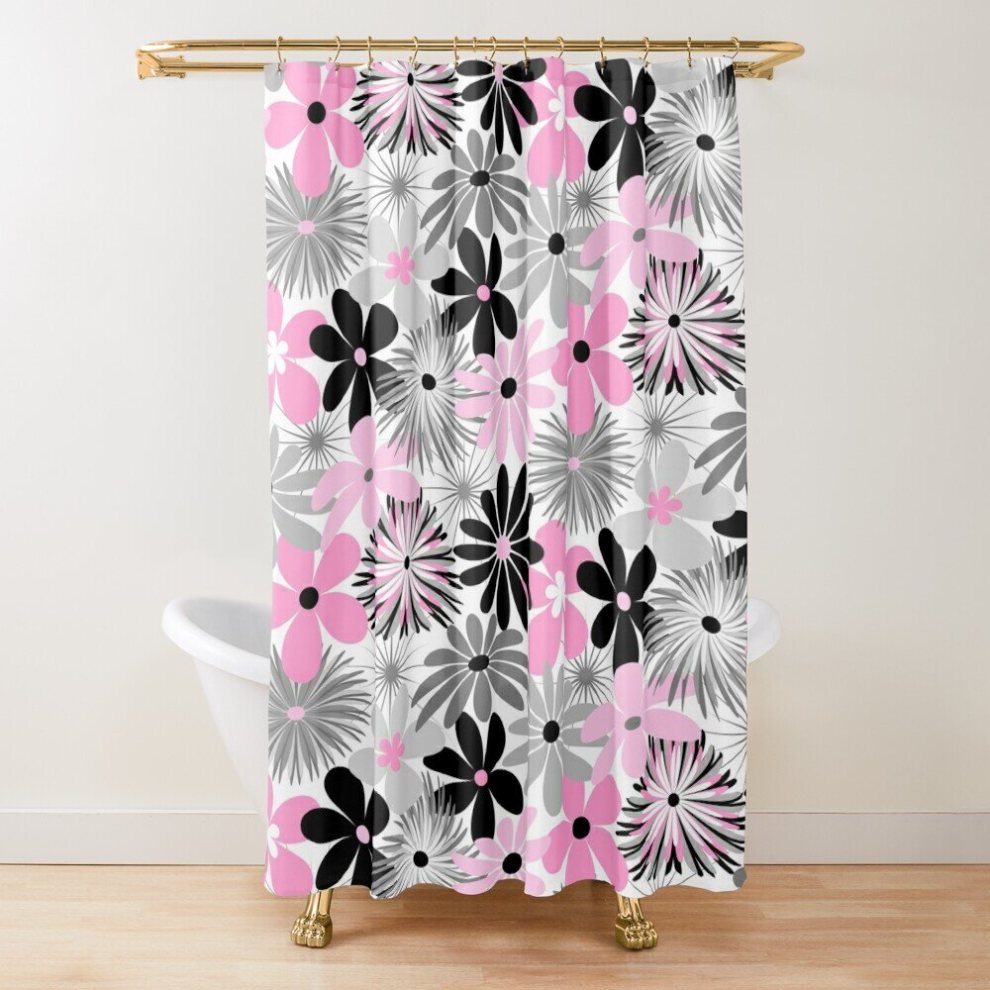 Shower Curtains Mid Century Modern Funky Flowers in Pink, Gray, Black and White for Bathroom Decor 72x72 inches