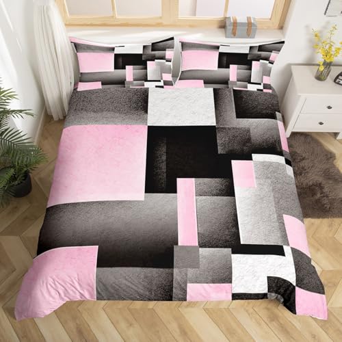 Loussiesd Kids Boys Teens Geometric Duvet Cover Modern Abstract Stripe Geometric Pattern Bedding Set Pink Grey Black Stripes Bedding Set Bedroom Decor