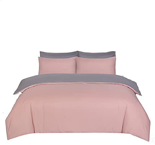 Ev Dekor® Duvet Cover Set King Grey Pink - Soft Microfibre Polyester Plain Dyed Reversible Double Duvet Set with Pillow cases - Bedding Quilt Covers Bedsheets
