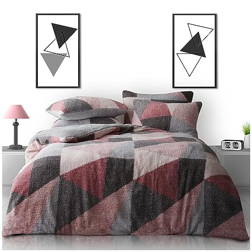 GC GAVENO CAVAILIA Teddy Bear Fleece Geometric Shapes Thermal Warm Teddy Fleece Duvet Cover Single Bed With Soft Pillow Case, Warm Fluffy Bedding Set, Blush Pink/Grey