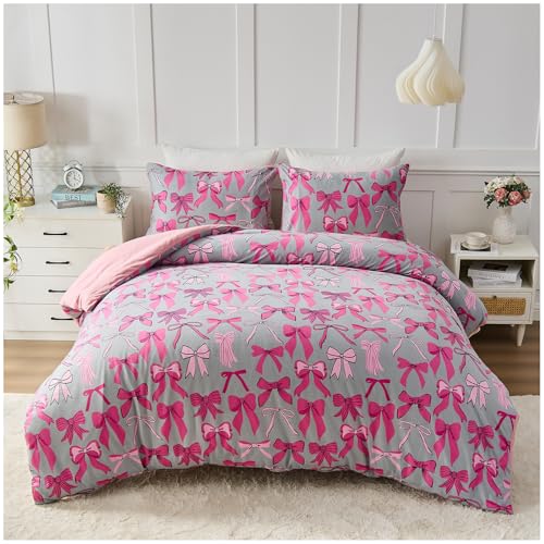 GC GAVENO CAVAILIA Ribbon Pattern King Size Duvet Cover Sets with Pillowcases - Easy Care Reversible Comforter Bedding Set - Soft Touch Bow Duvet Set Polyester Long-Lasting Bed Linen, Grey/Pink