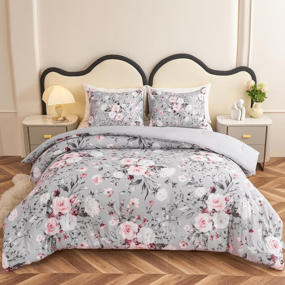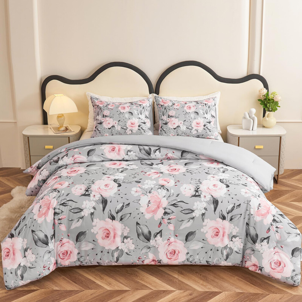 Koniroom 3 Pieces Pink and Grey Comforter Set Queen Size Floral Bedding Sets with Pink Flowers and Leaves Pattern for Women Teen Girls Reversible A