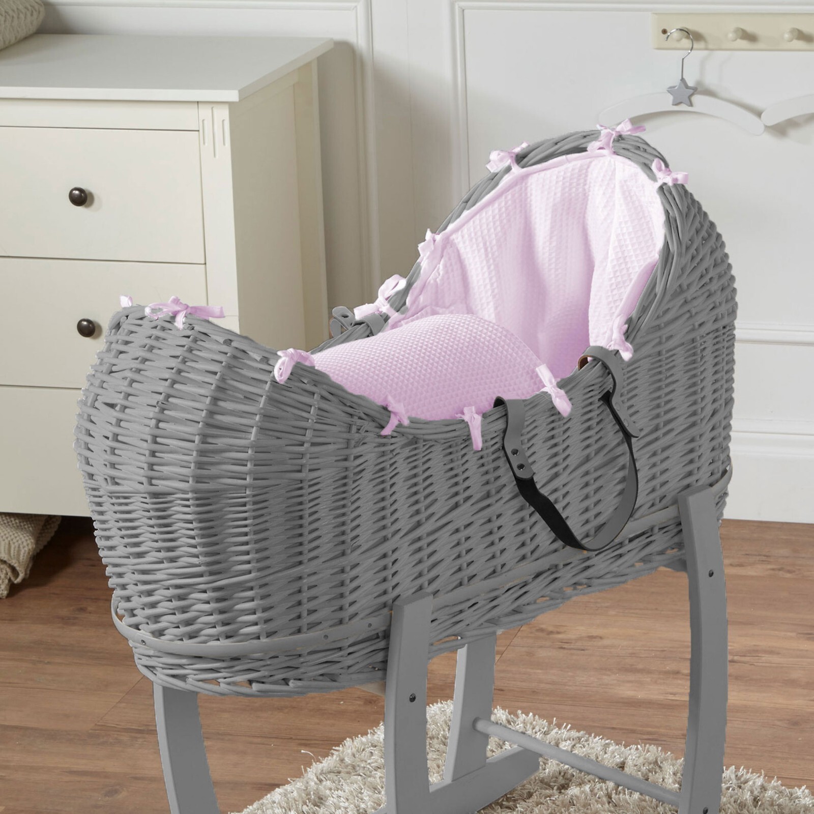 Baby Moses Basket Pink Waffle Bedding and Mattress Grey Wicker