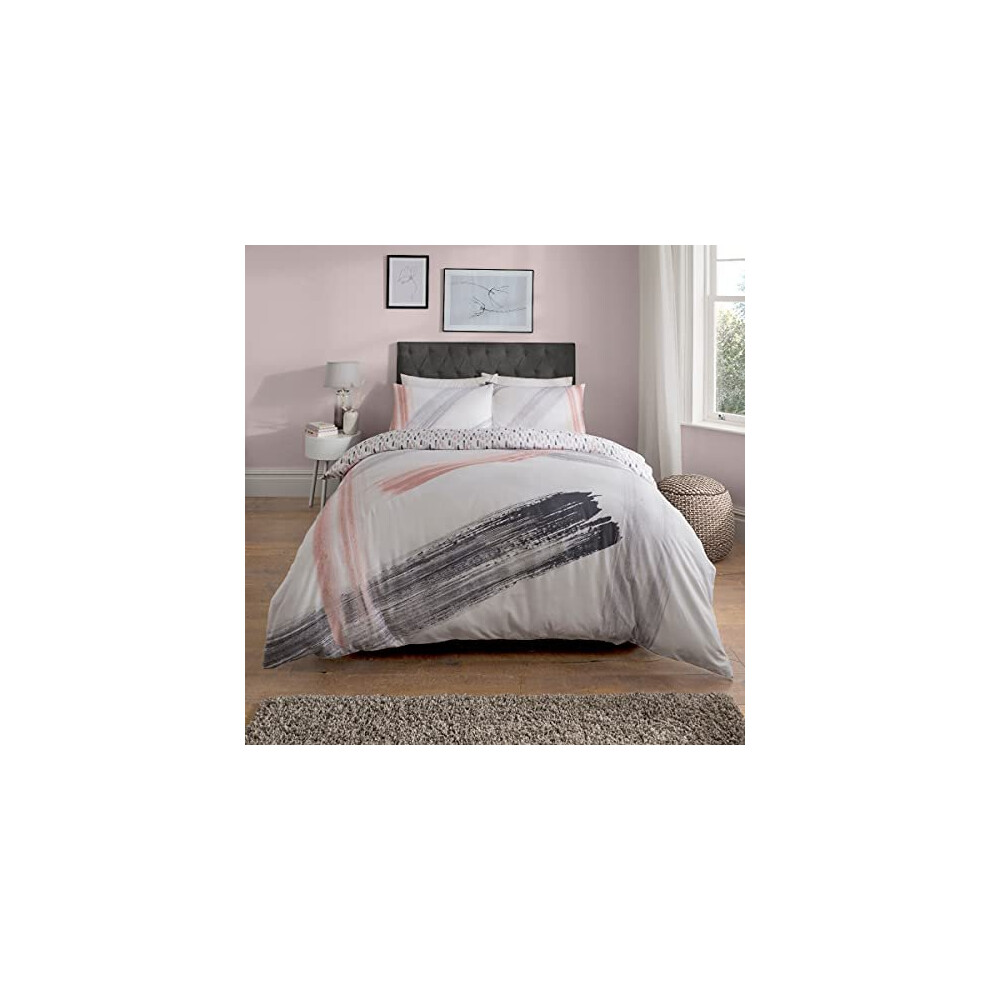 Sleepdown Abstract Brush Strokes White Blush Pink Charcoal Grey Reversible Duvet Cover Quilt and Pillow Cases Bedding Set Soft Easy Care-King (230cm x 220cm), Polycotton