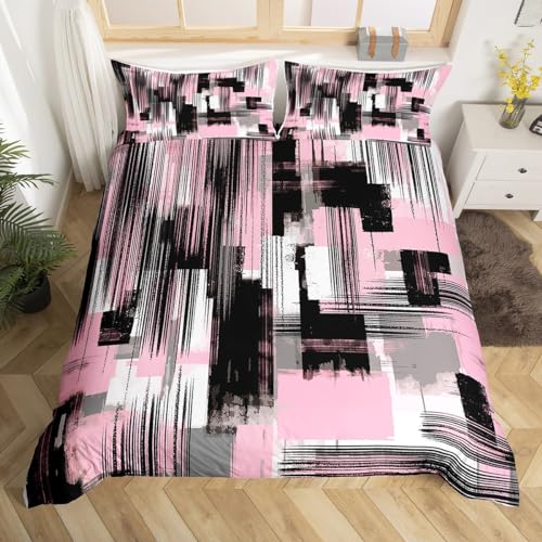 Loussiesd Pink Grey Black Bedding Comforter Cover Single Abstract Stripes Bedding Set for Kids Boys Girls Decor Stripe Line Duvet Cover Microfiber Modern Art Bedspread Cover Bedroom Bedclothes