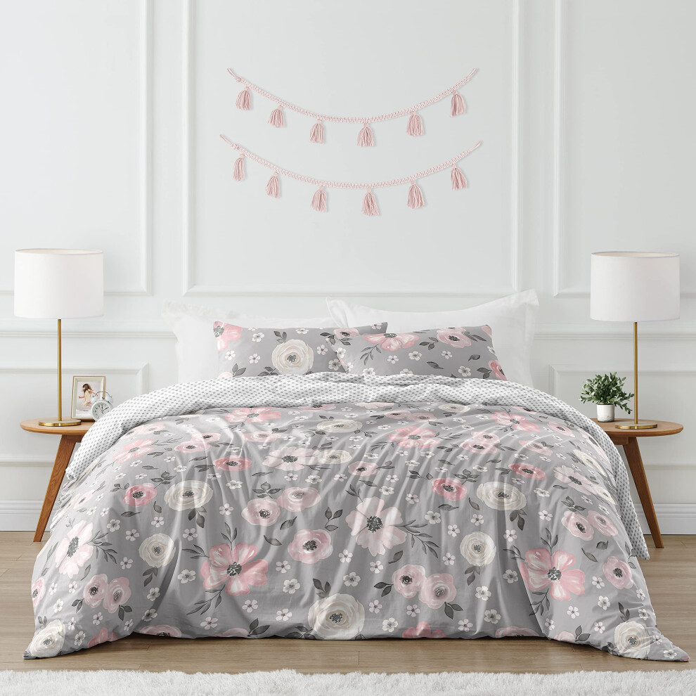 Sweet Jojo Designs Grey Watercolor Floral Girl Full/Queen Bedding Comforter Set Kids Childrens Size - 3 Pieces - Blush Pink Gray and White Shabby Chic