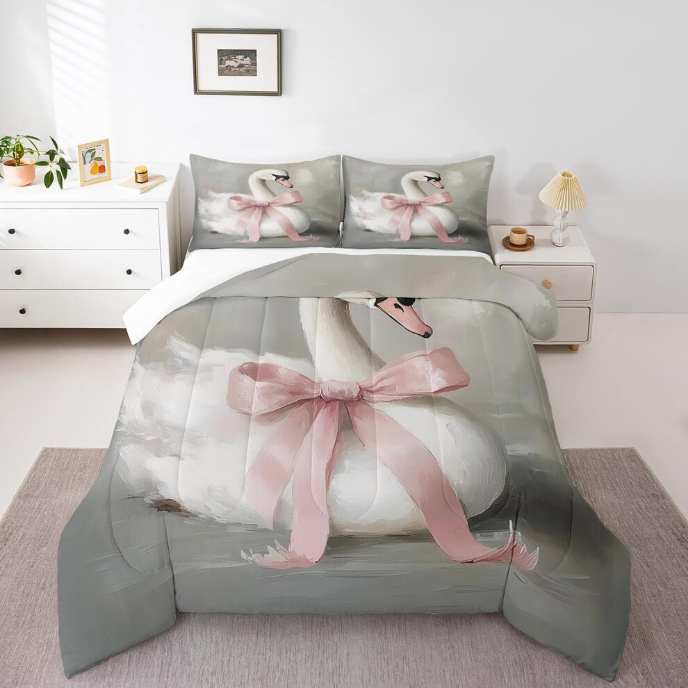 Swan Comforter Set Full Size Vintage Pink Grey Bedding with Classical Swan Design 3 Pieces
