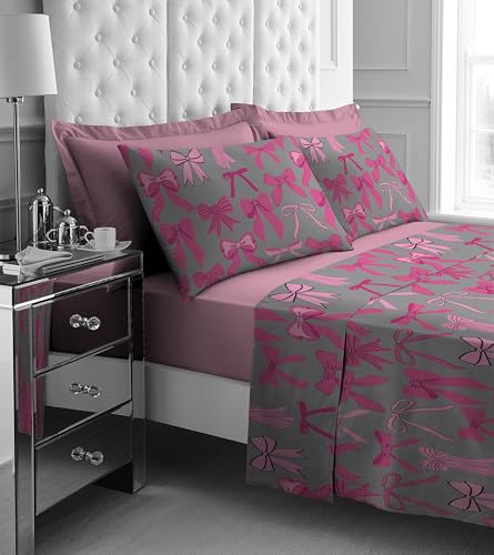 GC GAVENO CAVAILIA Ribbon Pattern Single Duvet Cover Set with Matching Pillowcase - Easy Care Reversible Comforter Bedding Set - Soft Touch Bow Duvet Set Polyester Long-Lasting Bed Linen, Grey/Pink