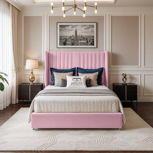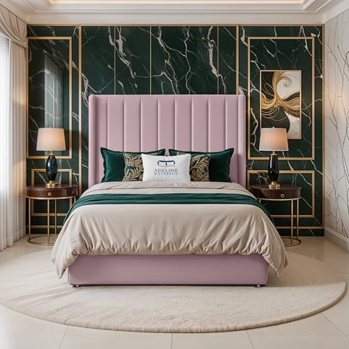 ADELINE WATERSON Arabella Upholstered Bed - Plush Velvet Headboard & Footboard - Slats Base - Elegant & Comfortable Bed (Pink, Double - Slats Base, Without Mattress)