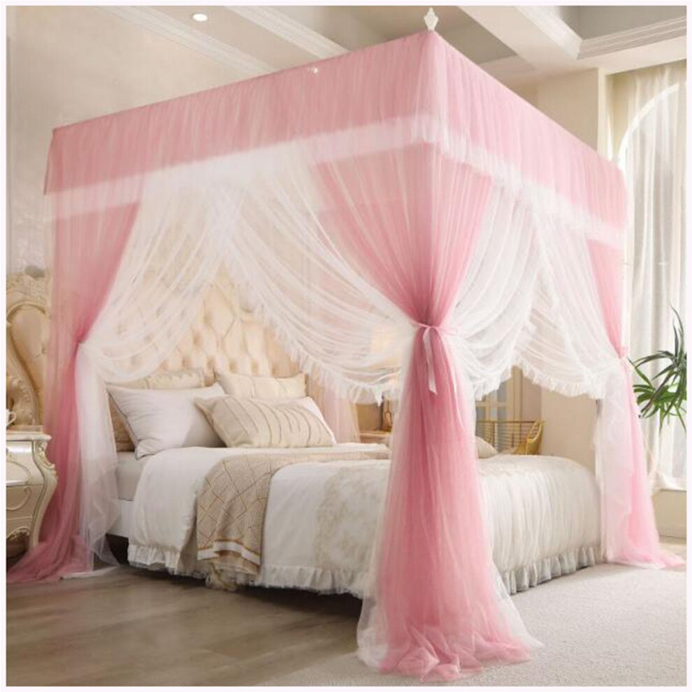 Square Top Cut Mosquito Net With Four Corner Posts And Frame Pink 1.5x2.0m Princess Bed Double Veil Floor Net