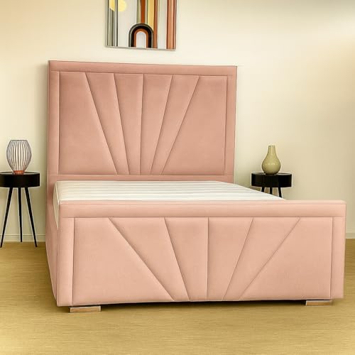 BED TIME UK - Luxe Pink Plush Bed Frame| Bed Base with Stylish 20" Vertical Liner Headboard | Bed Frame with 2-Drawer Storage (4FT Small Double)
