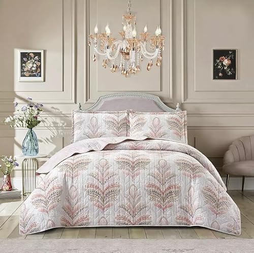 PRIME LINENS Luxury 3 Piece Quilted Printed Bedspread Set Throw Bedding Set Includes Soft Bed Throw Comforter with 2 Pillow Shams Embroidered Machine Wash (Jasmine Pink, Super King)