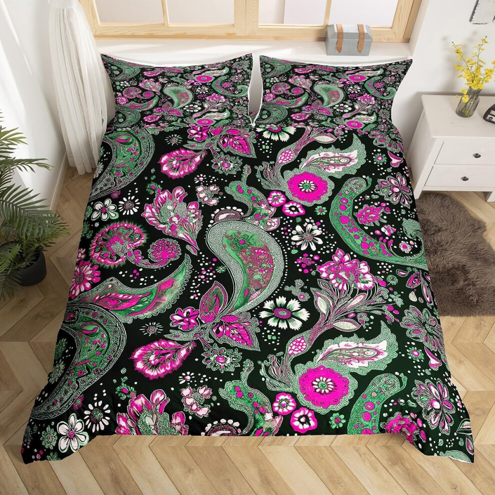 (Black Pink, Single(No Comforter)) Paisley Duvet Cover Double, Floral Farmhouse Bohemian Bedding Sets For Kids Boy Girls, Retro Damask Egyptian Soft N