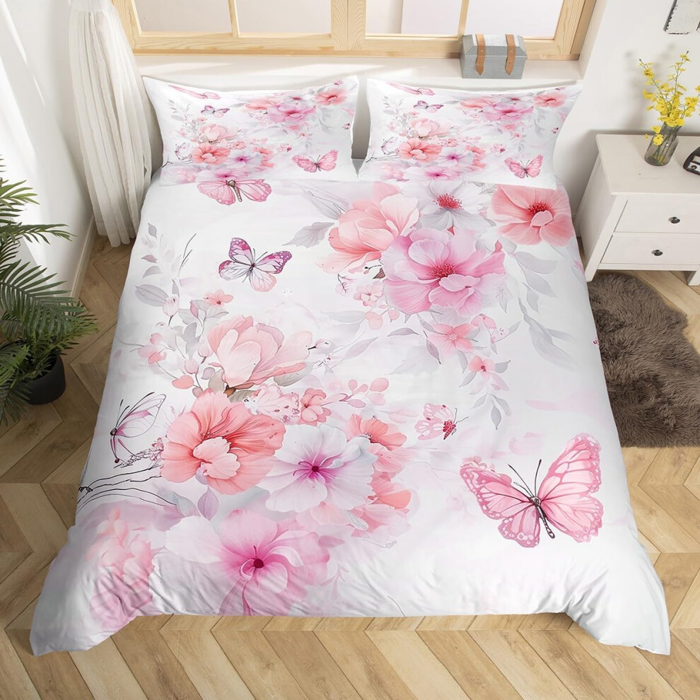 Bird Duvet Cover Double, Reversible Butterfly Bedding Sets, Polycotton Bed Covers, Pink