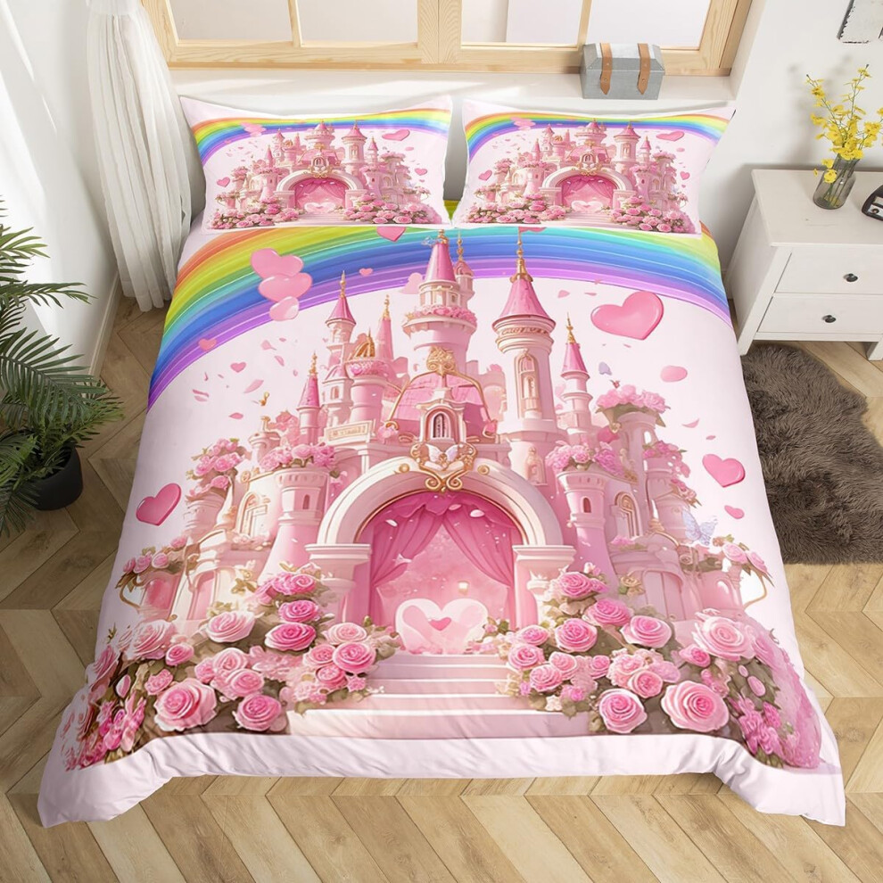 OHS Rainbow Double Duvet with Pillowcases, Girls Double Bedding Set Ultra Soft Decorative Kids Bed Sets Rainbow Flowers Bedding - Pink