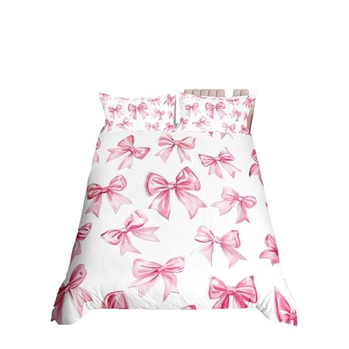 Homewish Pink Bow Duvet Cover Set Double with 2 Pillowcases - Dreamy Princess Style Bedding Set for Kids Girls Teens - Preppy Bowknot Quilt Cover Watercolor Ribbon Bow Bed Sets - Zipper Closure