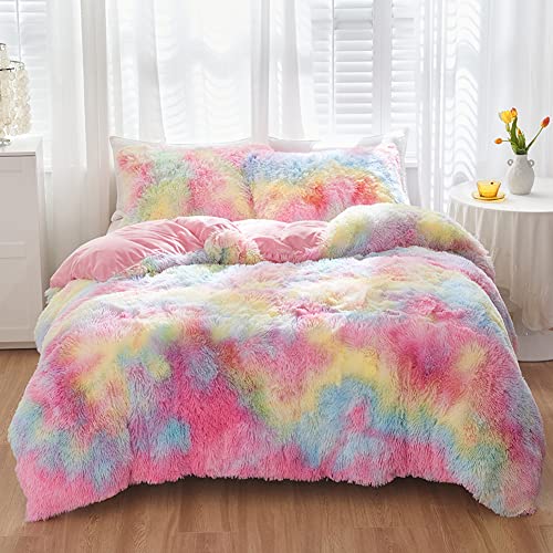 SUCSES Faux Fur Fluffy Girls Twin Bedding Set 3 Pieces Plush Shaggy Rainbow Duvet Cover Sets Colorful Tie Dye Furry Fuzzy Comforter Cover Set for Bedroom Decor (Pink Pastel, Twin Size)