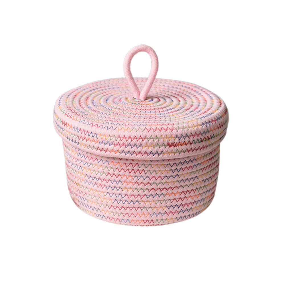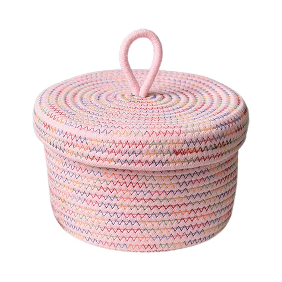 Containers with Lids Desktop Small Storage Basket Round Cotton Rope Woven Basket with Lid Home Organizing Box Decorative Woven Storage Bin Pink