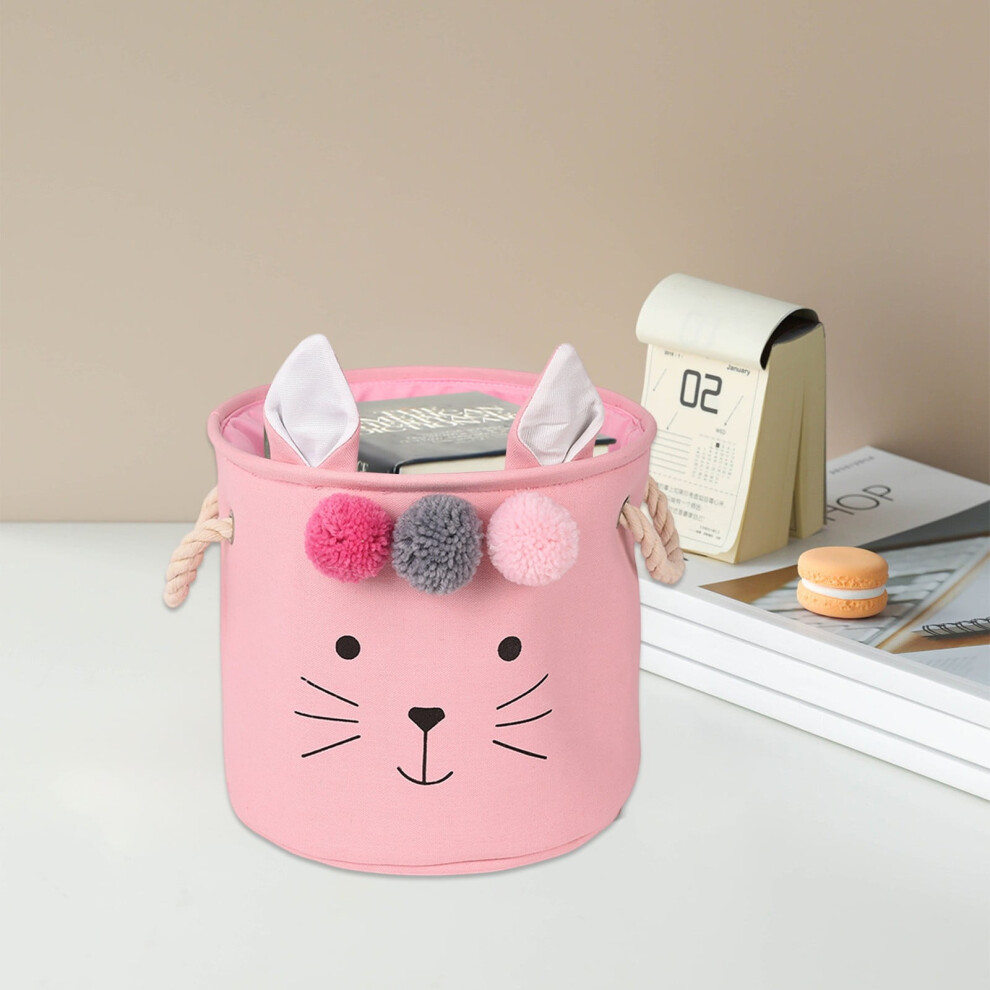Bunny Stuffed Animal White Pink Rabbit Face Bin Pompom Top Decorative Trim Decor Cute Animal Storage Container, Easter Eggs Clothing Toy Organizer