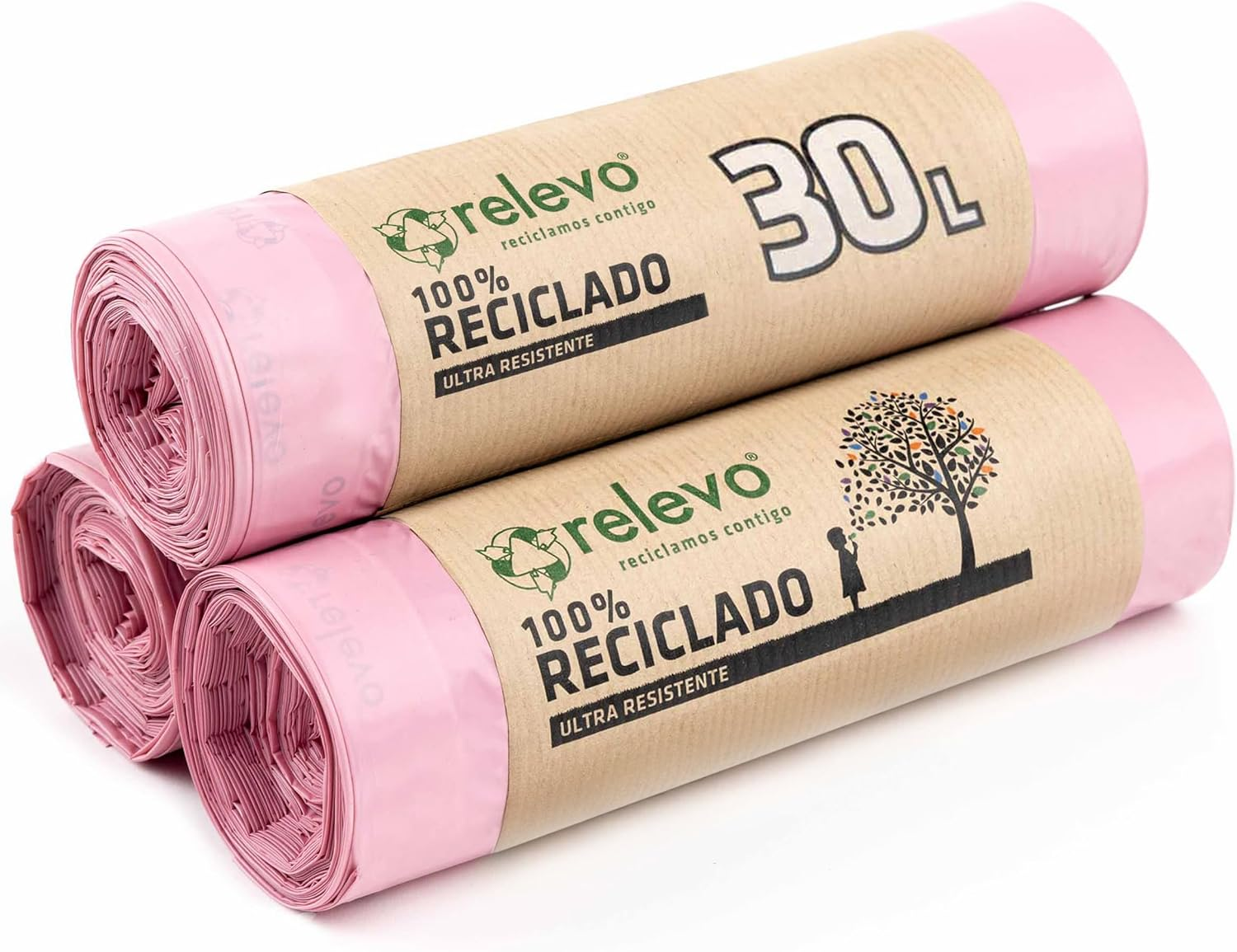 Relevo 30 Litre Scented Bin Liners – Pink Bin Bags. Made from 100% Recycled Material. Dimensions: 55 cm x 60 cm. Includes 45 units.