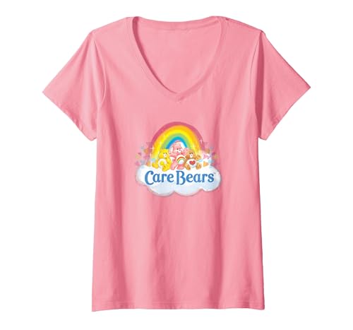 Women's Care Bears Vintage Rainbow Cheer Bear Sweet Group Logo V-Neck T-Shirt, Pink, Large