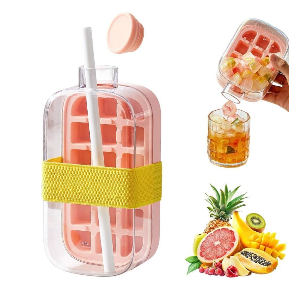 2in1 Ice Cube Maker Bottle with Straw, Leakproof Silicone Tray for Freezer Coffee Juice Pink L