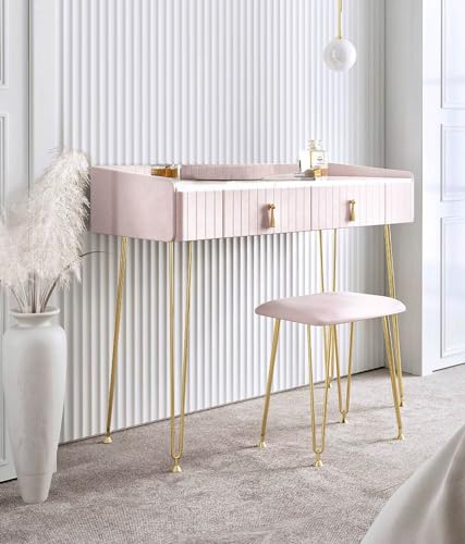 FABS Tokyo Glow Upholstered Quilted Velvet Dressing Table with 2 Drawers Stool Seat Vanity Table Makeup Bedroom Furniture Modern Rectangular Dresser Set (Ballerina Pink)