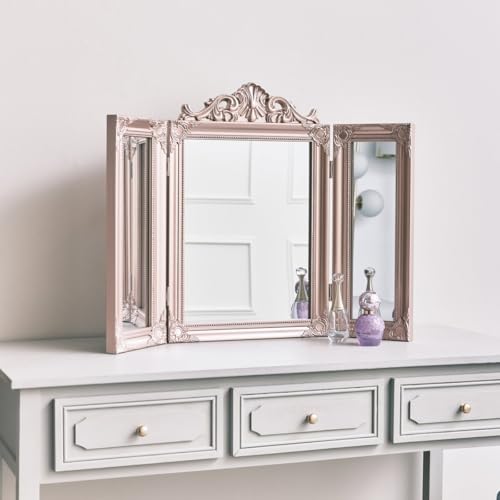 Melody Maison Rose Gold Pink Ornate Dressing Table Triple Mirror