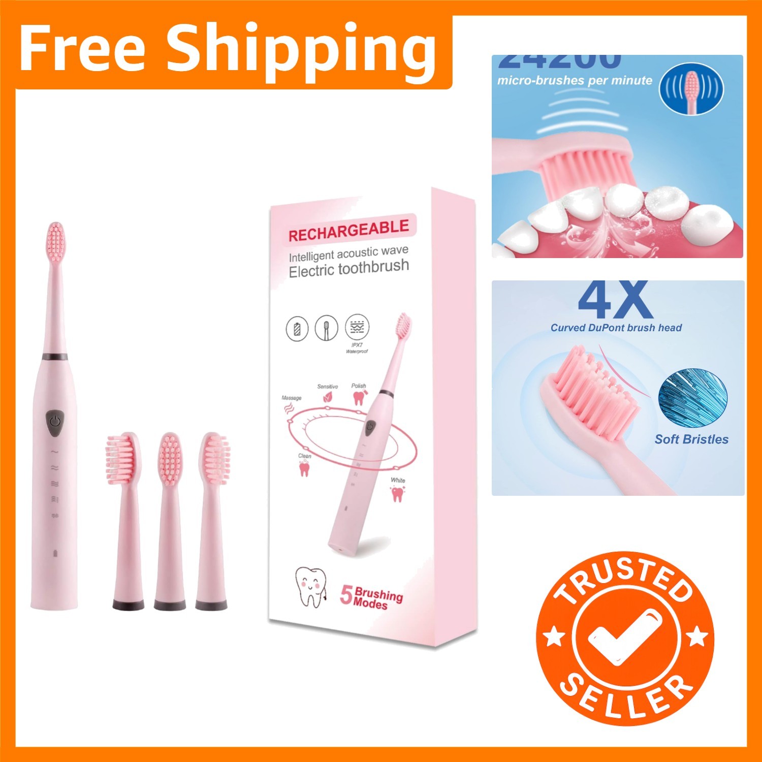 (Pink) Electric Toothbrush Sonic Vibration Rechargeable Toothbrush With 4 Brush Heads