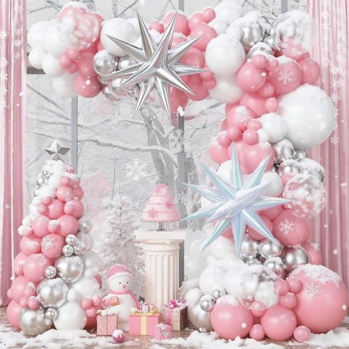Pink Winter Wonderland Balloons Garland Arch Kit, 121pcs Pink White Metallic Silver Balloons, Silver Iridescent Explosion Star Foil Balloon for Christmas Princess Birthday Winter Xmas Party Decoration