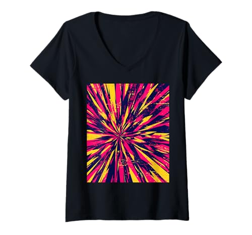 Womens Retro Abstract Synthwave Explosion Comic Neon Pink Yellow V-Neck T-Shirt