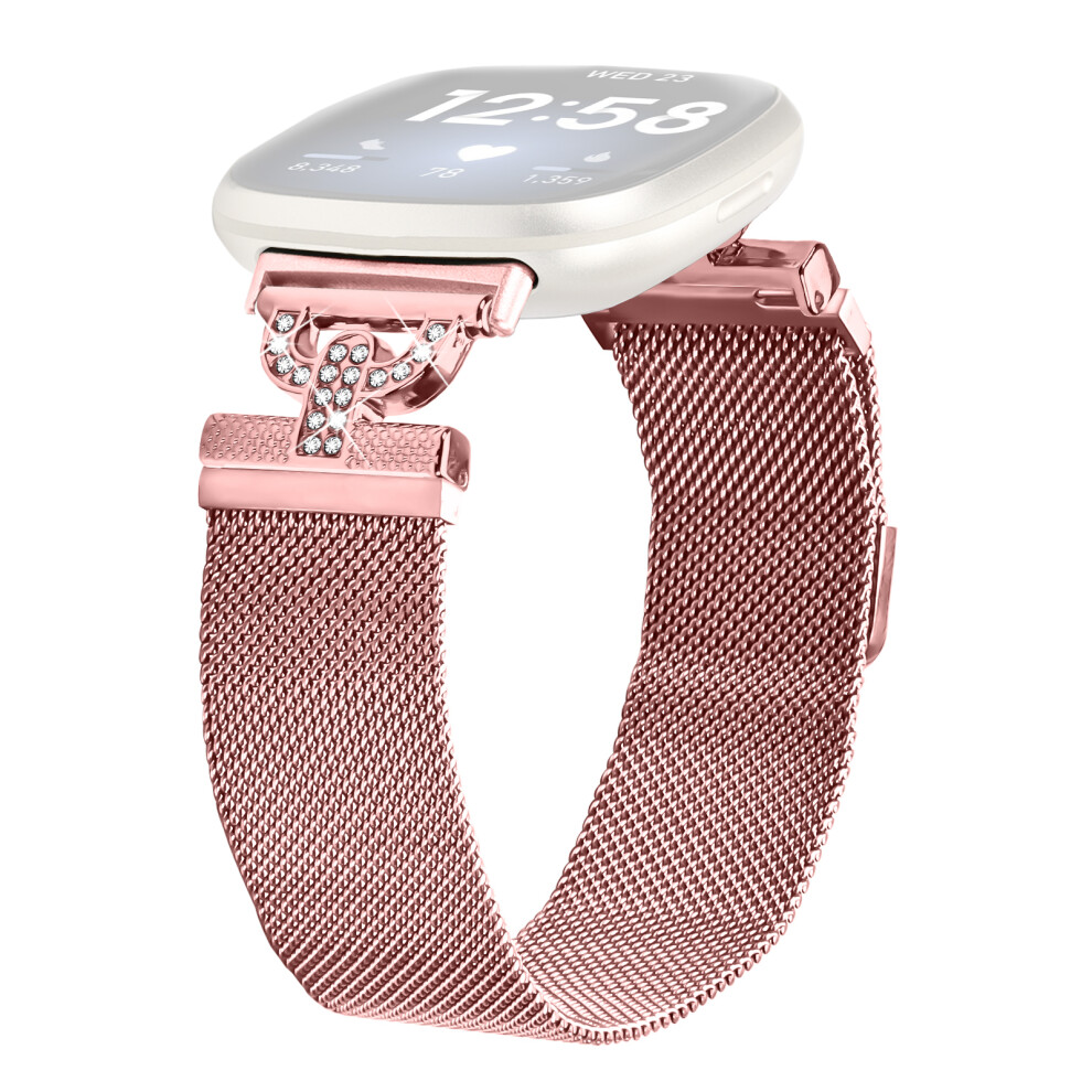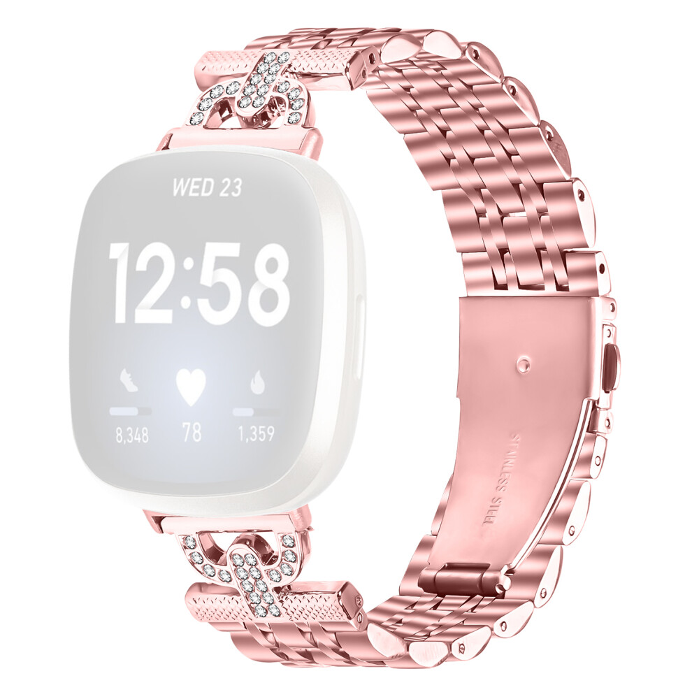 (Rose Pink) For Fitbit Versa 3 / Sense Watch Band Electroplating Stainless Steel Strap D-Shape Rhinestones Decor