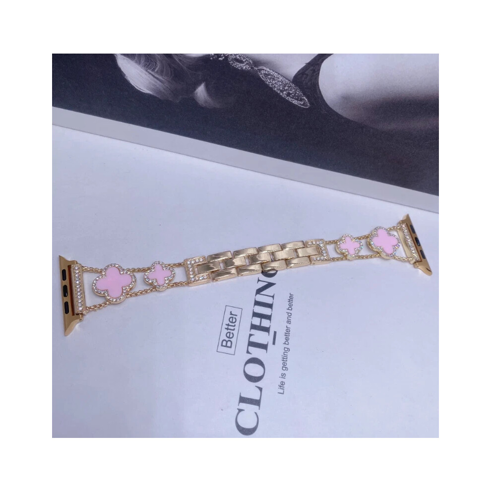 (Gold+Pink, Versa4) For Fitbit Versa 2/3/4 Diamond Inlaid Four-Leaf Clover Metal Watch Strap NEW