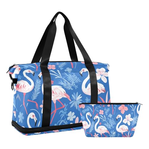 Pink Flamingos Blue Flowers Large Bag with Wet Pocket Adjustable Strap Sports Gym Tote Bag for Workout Large Capacity for Men Women