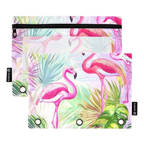 Artistic Pencil Pouch for 3 Ring Binder Tropical Flowers Pink Flamingos Zipper Binder Pencil Bag Pen School Binders Clear Pockets Custom 9.8" x 7.1", 2 Packs