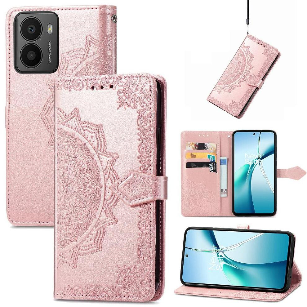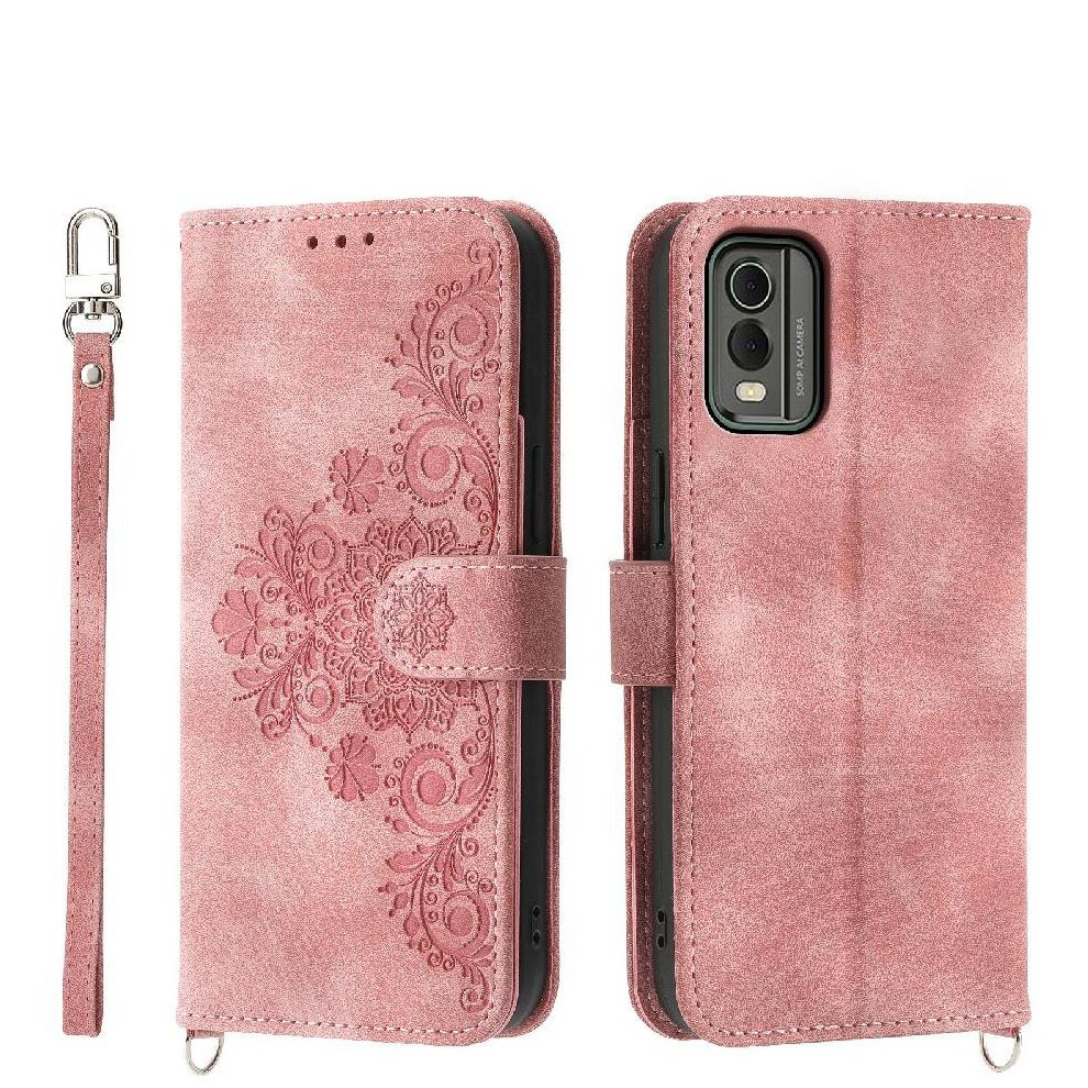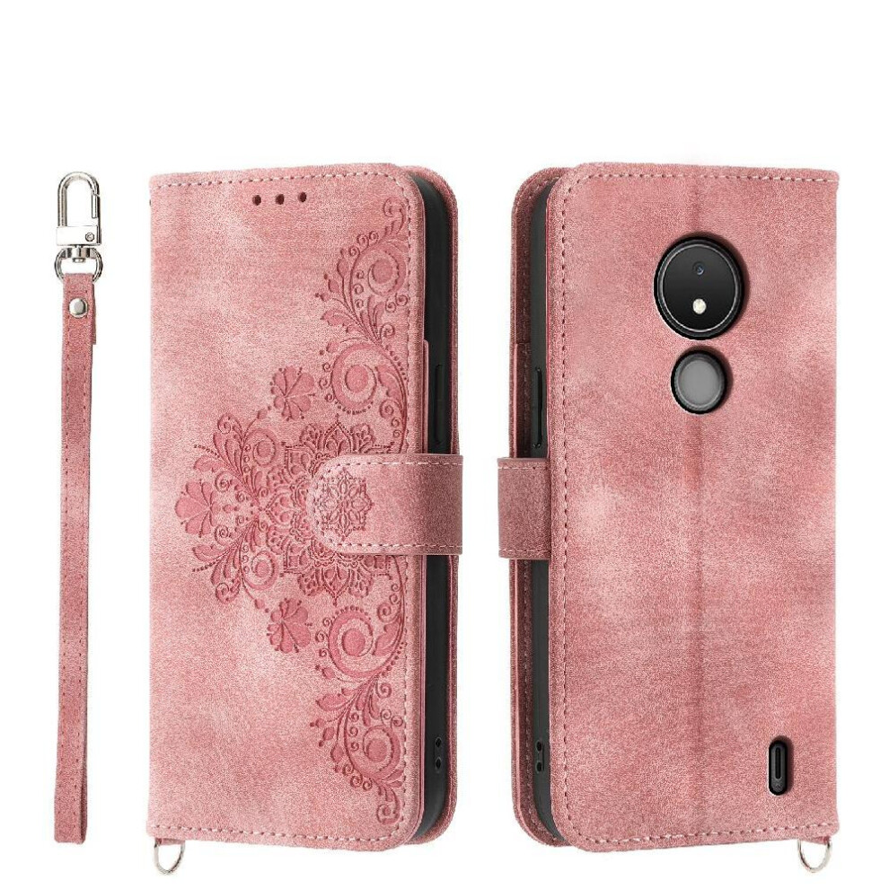 (Pink) Flip Case for Nokia C21 Plus Embossed Multiple Credit Card Slots Shockproof Wristband