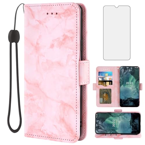 Asuwish Phone Case for Nokia G21/G11 with Tempered Glass Screen Protector and Marble Wallet Cover Flip Card Holder Slot Stand Leather Kickstand Mobile Cell Accessories G 21 11 6.5 Women Men Pink