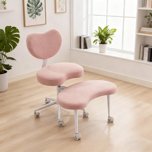 FEBORY Meditation Chair Plus - Ergonomic Cross-Legged Office Chair with Wheels, Adjustable Lumbar Support & 360° Footstool, Pink Teddy Fabric,300 lbs Capacity