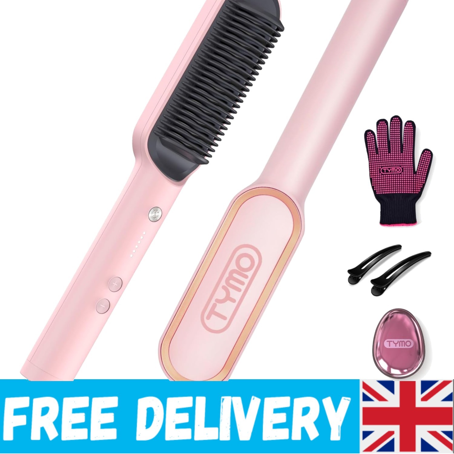 TYMO Ring Pink Hair Straightener Brush Hair Straightening Iron with Built-in Comb, 20s Fast Heating & 5 Temp Settings & Anti-Scald, Perfect for
