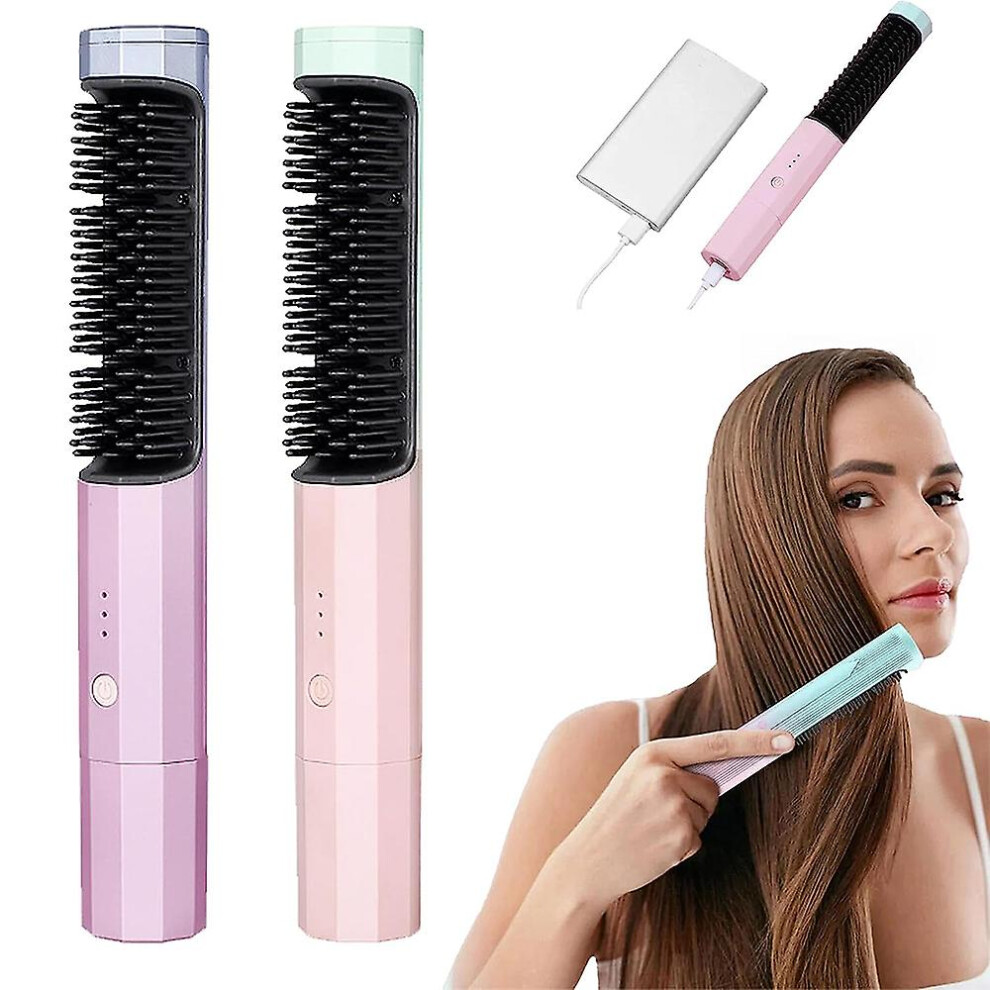 (Pink) Portable Hot Hair Straightener Brush With Usb Rechargeable, Hot Comb Hair Straightener For Eliminates Frizz